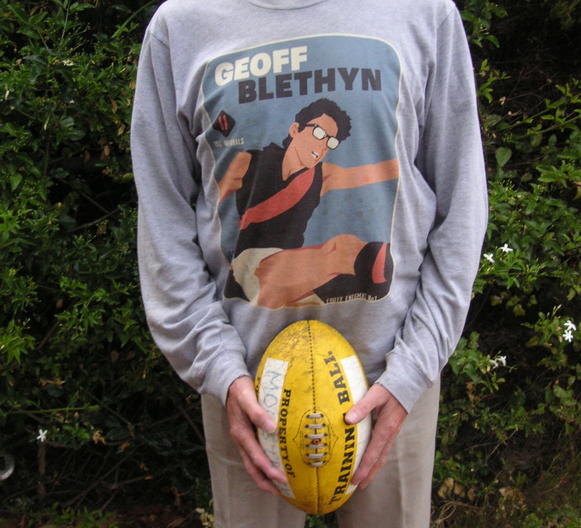 Geoff Blethyn played for Essendon in the late 1960s and early 1970s. He wore black glasses. He kicked lots of goals. At the same time. In 1968, aged just 17, he kicked four goals in the losing Grand Final against Carlton. Half the Bombers’ score. I barracked for Essendon. I wore glasses. I kicked goals – in my dreams mainly, but sometimes in the schoolyard, in the backyard, up at the local oval. I can’t say I’d given Blethyn a great deal of thought these past 40 or so years. But I’d never forgotten him. And then a guy in Hobart called Chris Rees designs a series of T-shirts about ‘1970s footy enigmas’. So, last year, for the first time ever, I make a Father’s Day request.