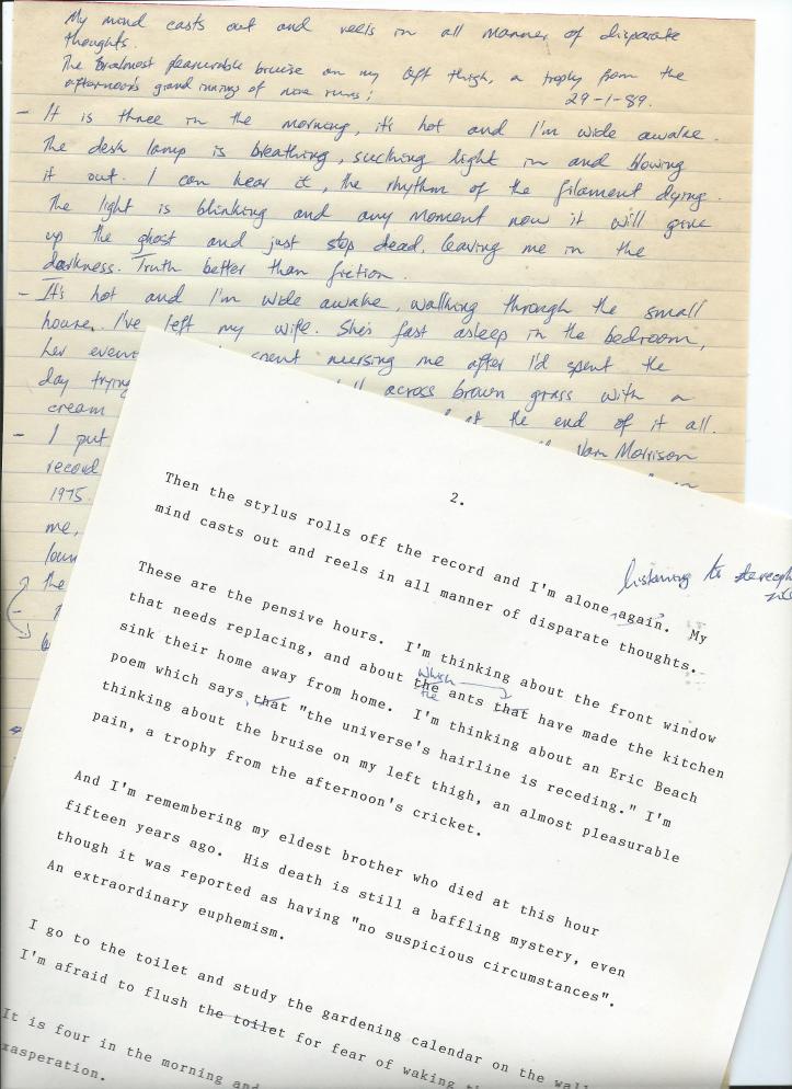 The first, hand-written, draft was written on the 29 January, 1989. Another hand-written draft two days later. Then  two drafts on the Brother electric typewriter. Then posted (or perhaps faxed ) to the Home supplement  at The Age on 2 February 1989. And published 12 months later, if my hand-written note at the top of the story is correct.