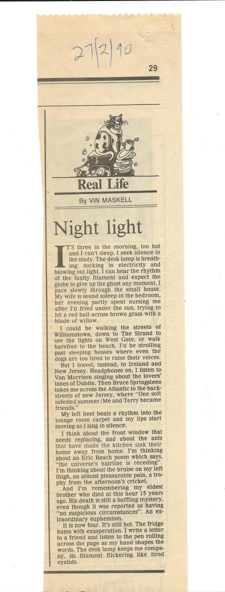 Yesterday a reader contacted me out of the blue and asked about Night Light, a story from The Age, from 1990. The reader had first read the story back then, when she was in Year 12. Her mother had posted the story to her.