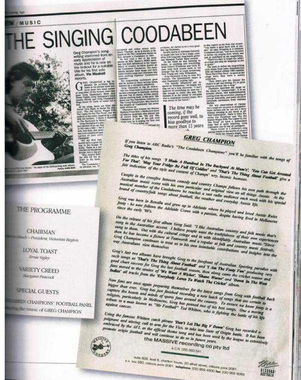 The second story reproduced in the scrapbook style of the publication looked at Champion’s non-footy songs, his song-writing. ‘The Singing Coodabeen’ was  for The Sunday Age. Don’t think we had a kick of the footy for that story. “Gotta look after my fingers these days,” said Champs, “the plight of the footy-loving musician!”
