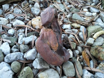 The rock is a little larger than my hand. It is pear-shaped, has several layers, and colours, from ochre to brown to tan.