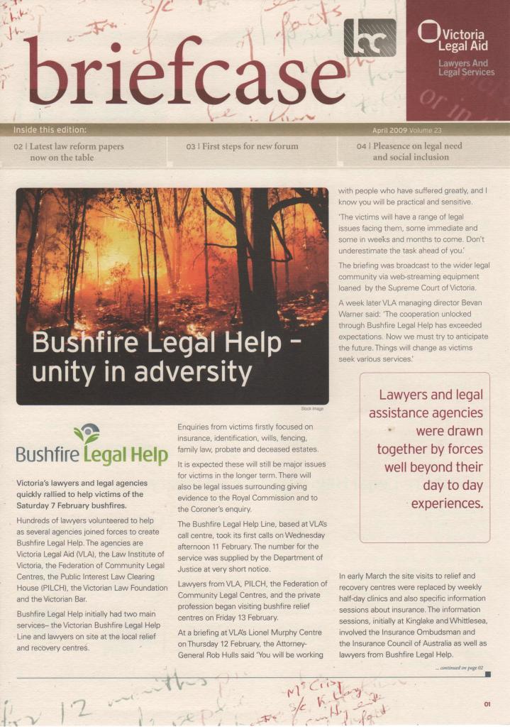 Victoria Legal Aid is a statutory authority, effectively the largest law firm in Victoria, with a staff of over 500 in 15 offices across the state. It represents 40,000 clients per year, takes 90,000 calls per year and distributes more than a million brochures per year. I edited the weekly online staff newsletter and the quarterly corporate newsletter for five years, until January 2011.